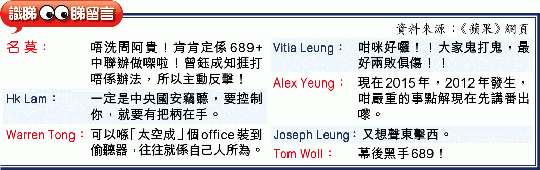 喺建制派WhatsApp內容外洩、仲未有人公開認係「內鬼」之時,《am730》噚日突然報道,曾鈺成3年前表明考慮選特首時,立法會6樓嘅辦公室俾人裝咗竊聽器,寓所都懷疑被人監視。由於當年佢篤爆過梁振英打過電話畀佢,聲言唔會搞佢嘅黑材料,所以唔少網民都話個竊聽器一定係CY裝㗎,但八方更關心嘅係,點解要喺風頭火勢之時引爆一單舊聞,唔通一如網民所言,用嚟轉移視線?