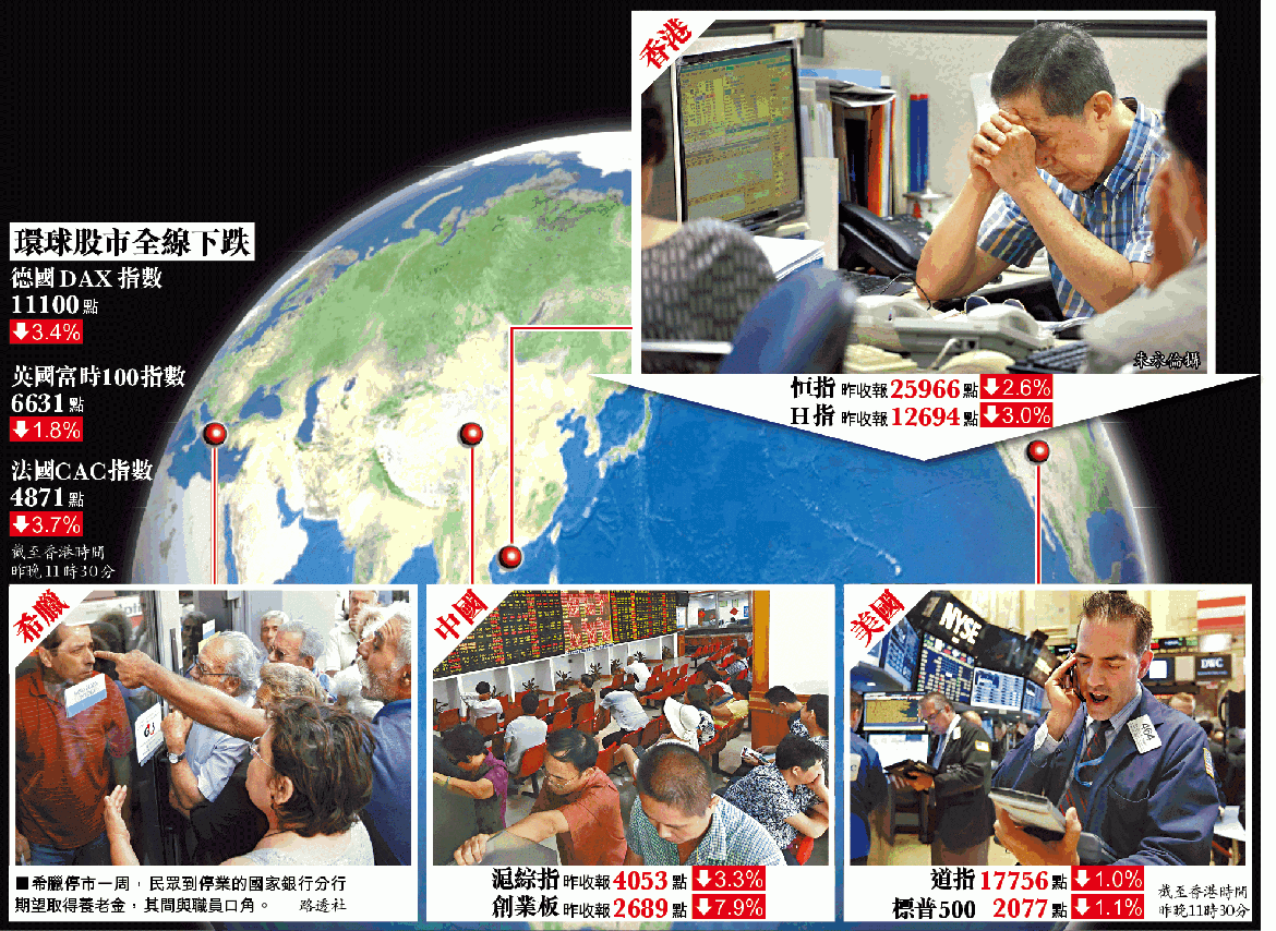 外圍方面,希臘昨日實施資本管制,加深市場對該國可能脫離歐元區的憂慮,觸發全球爆發小股災。歐洲股市為中港跌市接力,法國和德國股市曾跌逾4%,葡萄牙、西班牙及意大利等歐豬國曾下跌4.9%至5.8%,美股道指早段亦曾跌169點。雖然希臘股市停市,在美國交易的希臘股市ETF昨曾瀉15%。