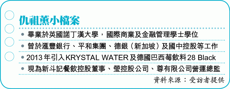 很多時富二代創業,也會選擇一些與家族本業相關的業務,惟新斗記太子爺卻選了一條較特別的創業路,進軍樽裝水市場,還要是引入香港市場上較少見的「中國水」。80後新斗記太子爺、瑩控股公司營運總監仇祖薰期望,由他親手引入的中國品牌「KRYSTAL WATER」,每季銷量能錄得5至10%增長。