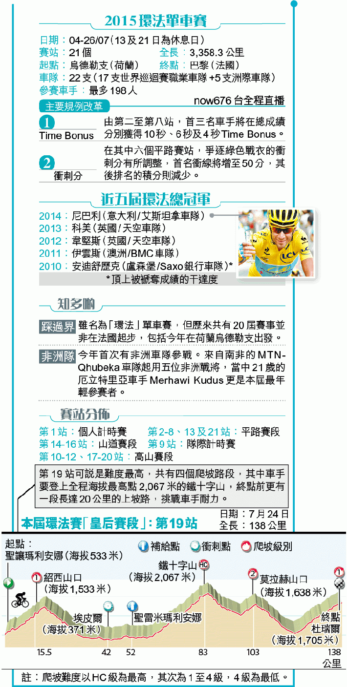 若法國象徵浪漫,干達度七次環法旅程也不乏激情。07年在領先車手拉姆臣缺席藥檢後被取消資格下「執雞」奪冠;09年在阿爾卑斯山拋離岩士唐,是贏得最無懸念一次。2010年在沒有贏得分站下再奪冠;去年炒車折斷脛骨後苦撐20公里才退賽。來到今年,他的旅程仍是與別不同──車壇三大賽事環意、環法及環西班牙賽相隔僅一個月,當勁敵紛紛棄戰環意,干達度毅然出征。