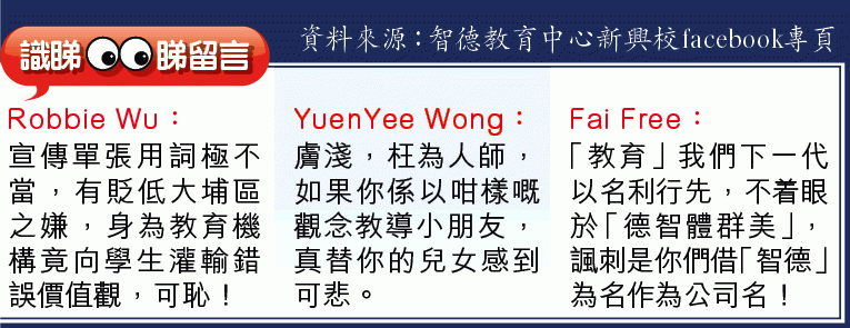 該宣傳單張被上載至互聯網,網民指斥該補習社歪曲正確價值觀,亦有大埔居民不滿該補習社有貶低該區之嫌。面對網民批評,智德教育中心新興校在facebook專頁竟回應「俾人投訴,呵呵」,並引用宋真宗趙恒《勸學詩》中的「書中自有黃金屋」反擊。本報昨致電該中心,惟因公眾假期,本報只能留言,截稿前未有回覆。