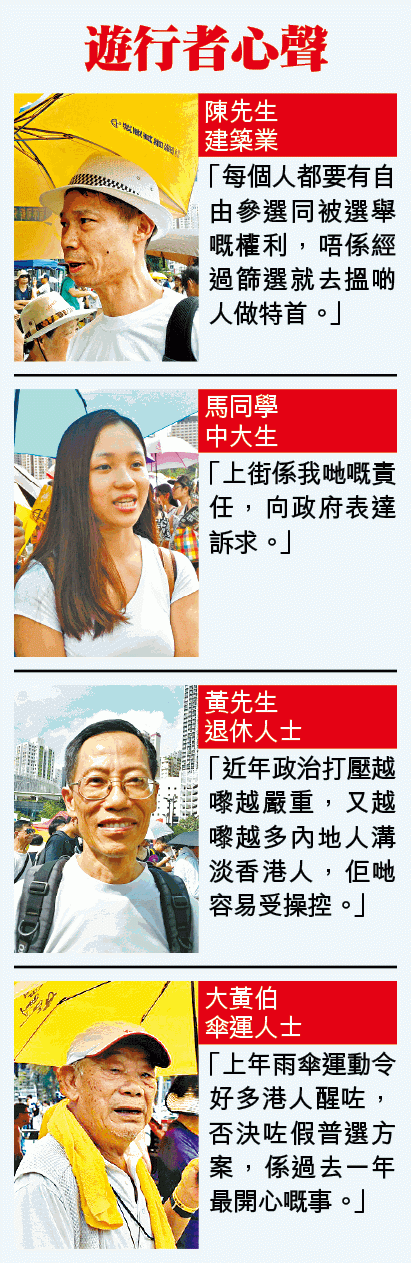 《蘋果》昨在出席遊行的市民中進行民調,有47%的受訪者表示會在今年區議會選舉中投雨傘族一票,比起表示會投傳統泛民一票的高出近5個百分點;表示將票投激進本土派的受訪者亦有近一成。中大政治與行政學系高級講師蔡子強認為,在遊行人士中不少曾參與雨傘運動,故雨傘族在民調中獲得最多支持是很自然的事;但雨傘族在來屆區選的選情仍要視乎最終落區參選的人數。