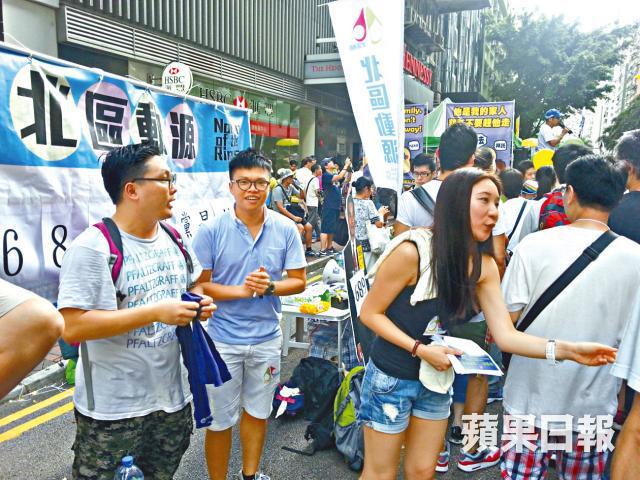 【本報訊】雨傘運動後一班年輕政治素人撐開雨傘降落不同社區,積極考慮參加年底區議會選舉,誓打破建制派壟斷局面。昨最少5個傘兵團體在遊行沿途擺街站,包括高呼「港中要區隔,殲滅賣港賊」的青年新政,宣揚以議會路線捍衞本土及公義,及籌款為未來行動作準備;另一傘兵北區動源高呼「北區事非北區人嘅事」,希望市民一起防香港赤化。
