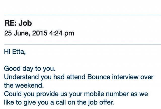 小龍女吳卓林平日愛以Instagram跟朋友分享軼事,除了日前上載由媽咪為她拍攝的大頭相,騷其新剪的髮型外,小龍女早前也上載了一張email cap圖到ig,興奮地表示:「Oh my GOD YES。」原來她早前到室內彈床樂園BOUNCE公司應徵,獲對方回覆叫她提供聯絡電話,以確認工作細節。