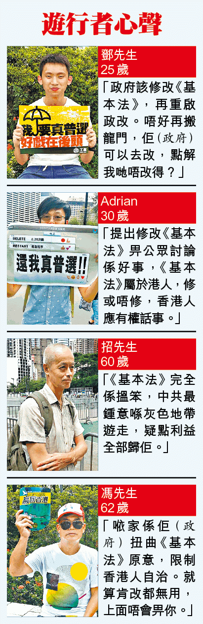 【本報訊】政改方案否決後,推倒人大8.31決定、重啟政改成為今年7.1遊行主題之一,雖然政府聲稱現屆不會再處理政改,但參加遊行的民主黨創黨主席李柱銘、壹傳媒創辦人黎智英等人均認為,港人要對重啟政改有信心,不能留待下屆政府才做。前政務司司長陳方安生更提出建議,指現屆政府可透過本地立法,擴大立會及特首選舉選民基礎。
