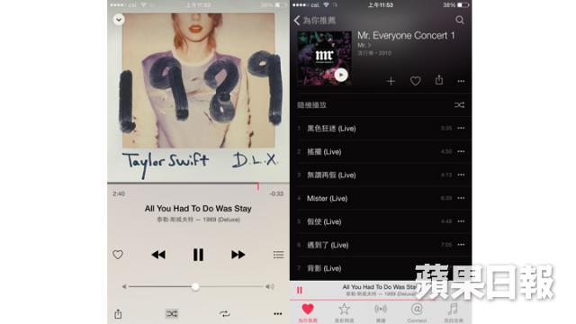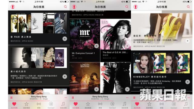 記者本身有使用Spotify及KKBOX,尤以前者為主,因為喜愛使用推薦歌曲的功能。暫時用了一晚Apple Music,最欣賞是在最左邊的「為你推薦」,當中可以上下拉動,當中會有推薦的歌單,亦有因應用家聽歌習慣而建議的專輯,記者留意到這個清單經常變動,估計是因應聽歌紀錄而變化,相比Spotify推薦的歌曲,來來去去都是那幾隻,Apple Music的推薦雖然暫時未必完全啱我口味,但最少新鮮感夠晒。