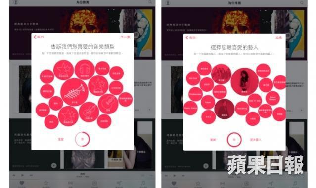在使用Apple Music之前,有一個「為你推薦」功能不得不提,並不是說它的推薦有多好,而是在你開始使用之前有一個選項可以讓你挑選自己喜歡的歌曲類型,有爵士樂、日文、韓文、國語等等多達17項歌曲類型。在以上選擇中按兩下代表非常喜歡,按一下代表喜歡,而長按兩秒則會刪除該項選擇。當你把喜歡的歌曲類型選擇好後,就可以正式享用Apple Music「為你推薦」功能,讓Apple為你推薦各類歌曲,加強你的音樂庫。