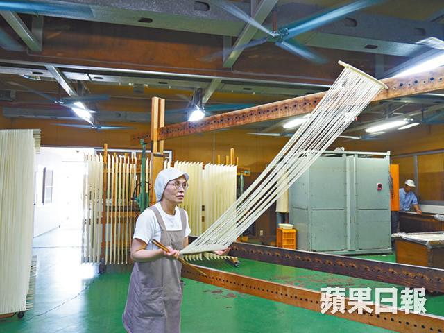 但拉麵還未完,分開了麵條後,還要再拉兩下,把麵條垂直掛在木架底部,眼前素麵如水簾般在眼前。只是因為拉扯時,麵條會黏在一起,真砂太太再顯功架,左右快速挑起黏着的麵條,眼明手快下,就把麵條一條條分開了。「這次要快同仔細,因為麵條一黏着就不容易被風乾。」