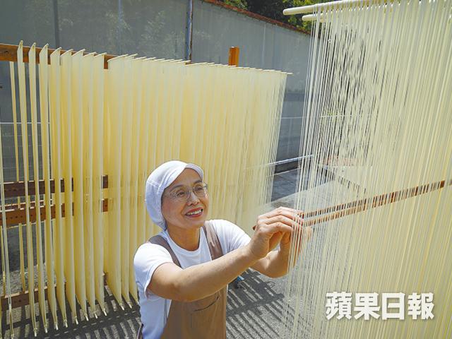 麵條掛了在架上後,會放在室外太陽底下曬,因有風時好容易把麵條吹貼一起,所以時刻要用筷子把麵條分開,還要每隔30分鐘就要調校木架的高低,一直把麵拉成1.5至1.8米長。哪何時曬得全乾呢?「不是全乾,麵條要保留23%水份,如果全乾就會斷。」