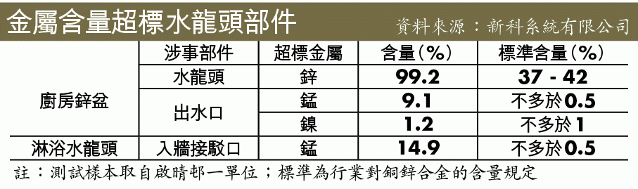 據房署資料,啟晴邨的水龍頭應為黃銅。惟化驗結果顯示,廚房鋅盆水龍頭鋅含量達99.2%,銅僅佔0.7%。據行業對銅鋅合金的含量規定,鋅含量應為37%至42%,銅應為58%至63%;另外,鋅盆出水口金屬錳含量達9.1%,高於不多於0.5%的標準。而花灑水龍頭的入牆接駁口,錳含量亦達14.9%。