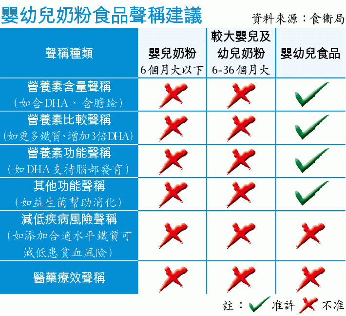當局昨向立會提交諮詢結果,118份意見書中,普遍支持以較嚴格方式規管配方產品。當局參考食品法典委員會及世衞建議,加上避免大仔奶粉容許有聲稱時,家長誤以為同品牌細仔奶粉有同等功效,決定36個月以下嬰幼兒奶粉一律禁止作出聲稱。嬰幼兒食品方面,當局則未有限制營養及健康聲稱;但減低疾病風險及醫藥療效的聲稱,則與配方奶粉一樣全面禁止。家長日後想了解配方產品成份資料,可閱查閱包上營養標籤及配料表。