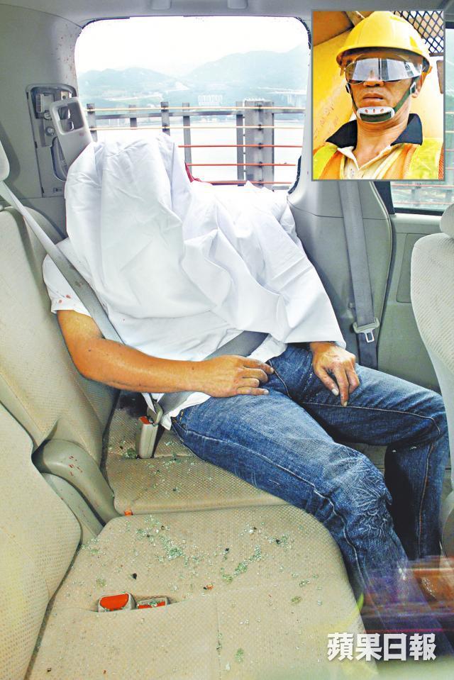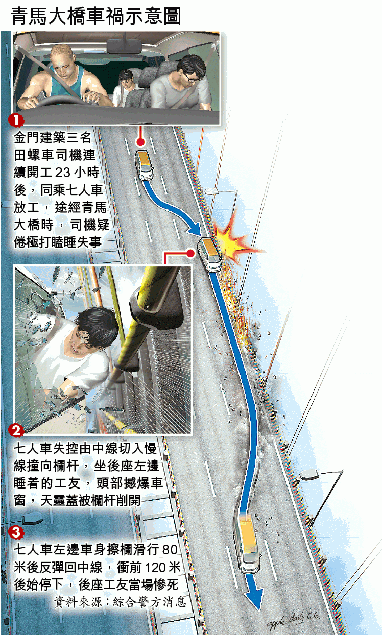 【本報訊】金門建築屬下三名田螺車司機,在機場地盤連續工作近23小時後,放工同乘一輛七人車回家,途經青馬大橋期間,疑司機倦極打瞌睡,七人車失控撞向大橋鐵欄,坐在後排一名正倚窗而睡的工人,頭部撼爆車窗,天靈蓋當場被欄杆削去,腦漿四溢慘死。司機與同車另一工友沒受傷,司機涉嫌危險駕駛導致他人死亡被捕。
