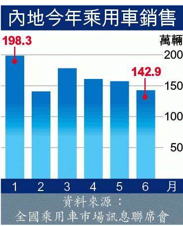全國乘用車市場訊息聯席會公佈,6月份中國汽車銷量約143萬部,按年減少3.2%,為2013年2月以來,單月銷量首次錄按年倒退。與不少汽車生產商指、股市下跌拖累買車意欲的說法吻合。