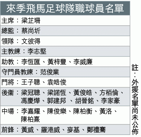 【本報訊】飛馬昨公佈新球季大軍名單,陣中以澳滌年輕華將為骨幹,配合上季最佳教練李志堅執教,助教人選為前南華中場李威廉。