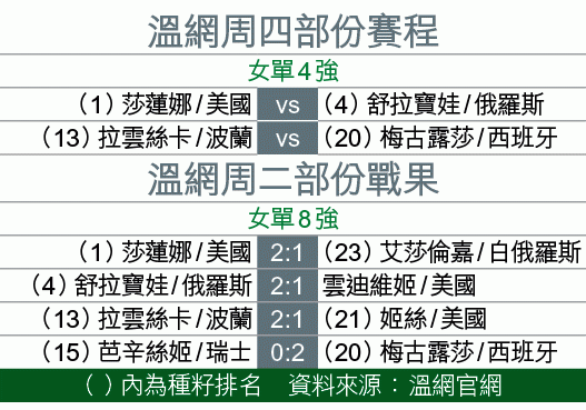 【綜合英國外電】溫網今日上演女單準決賽,一姐莎蓮娜與前一姐舒拉寶娃這對宿敵,將會再於溫布頓草地上交鋒。(now670及671台今日6:30pm起直播)