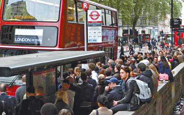 英國倫敦昨日傍晚起交通陷入大混亂,事緣地鐵勞資談判破裂,地鐵四大工會攜手罷工24小時,是倫敦地鐵自2002年以來首次全面停擺。雪上加霜的是有鐵路公司亦鬧工潮,罷駛48小時,令數以百萬計下班乘客陣腳大亂,要改為逼巴士和其他交通工具。但來往機場的各鐵路服務維持正常。