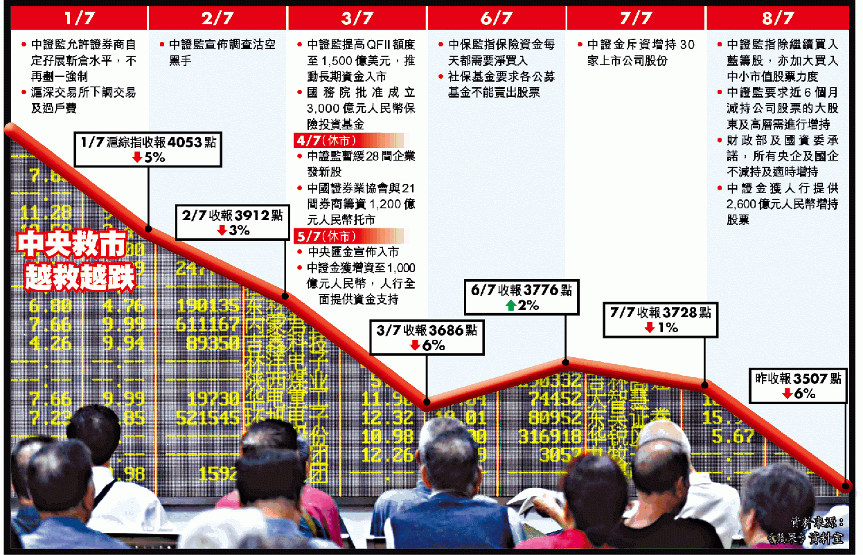 內地網民紛紛斥中央救市不力。有網民指,「跌成這樣了還在說慢牛嗎?國家在忽悠我們股民,太可恨了,從虧損30%一直到現在80%,我們一而再、再而三的相信國家,為甚麼要這樣對待我們?」有股民批評當局越救越衰,「今天抄底的人,本以為是底了,沒想到還有地下室……」也有建議索性休市:「強烈要求明天休市,想好對策再開市,要打就打勝仗。」昨日微博就廣傳一個自我解嘲的辦法:「股民花錢被政府嫖了還捨不得下床,總認為政府在摸褲子口袋時是要給錢,可每次都是拿出個套套來,再被糟蹋一遍。」