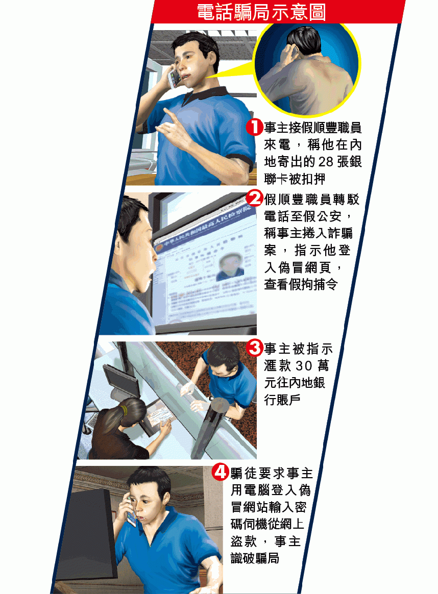 本月5日,一名操普通話、自稱順豐職員的騙徒致電Thomas,指他在河北省保定市寄往泰國的包裹打回頭,又透露包裹內藏28張銀聯卡,已被公安扣押,估計其個人資料被盜用,建議他報公安,並可協助轉駁電話。