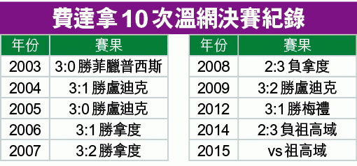 溫布頓一向是費達拿的福地,在2003年,這位還未足22歲的小伙子就是在這裏贏得職業生涯首個大滿貫。轉眼12年,費達拿將第10次來到決賽賽場,爭逐第八個冠軍,他說:「不管是第八還是第一次冠軍都不重要,能夠躋身溫布頓決賽,意義都是最重大的。」綜合英國外電