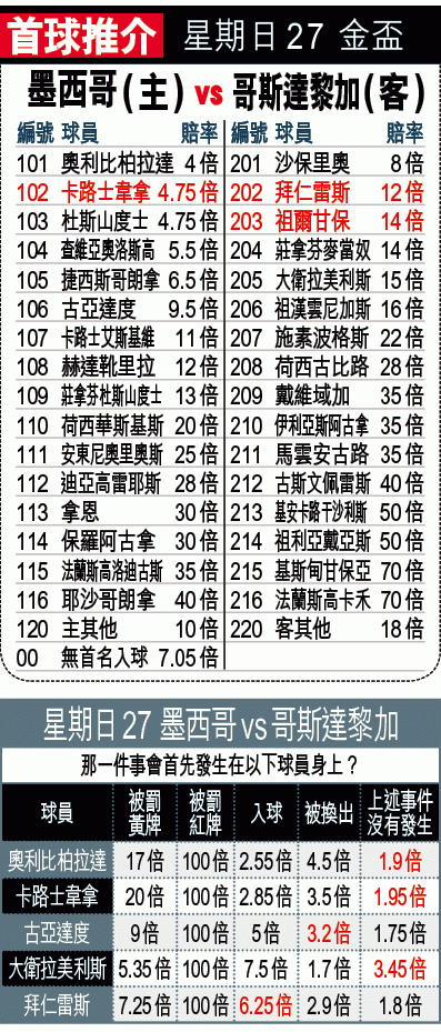周日續有兩場美洲金盃八強賽事上演,其中墨西哥與哥斯達黎加爭逐準決賽席位;前者今屆賽事表現飄忽,難在法定時間內贏波,博哥斯達黎加頂得住,受讓半/一捧下盤。