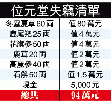 【本報訊】中藥名店位元堂的觀塘瑞和街分店昨遭爆竊,一名「識貨」賊人專吼並列「補身三寶」的冬蟲夏草、鹿茸和人參下手,偷去大批名貴藥材,其中一批有「藥黃金」之稱的野生蟲草王,每両價值高達14,400元,全部被偷名貴藥材總值逾90萬元。