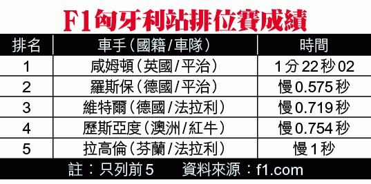 上周六的F1匈牙利站排位賽,又是平治車隊的天下,咸姆頓以約半秒之差力壓隊友羅斯保,將會在周日的正賽以頭位出賽。前世界冠軍艾朗素就在Q2壞車,要親自推車回維修站。(now670台今日7:30pm直播正賽)