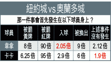 紐約城上仗僅敗予新英倫革命,並有中場格拉巴禾領紅需停賽,幸主場出擊已漸上軌道,近五仗僅在打吡戰不敵紅牛。雖然前車路士名將林柏特仍受小腿傷困擾尚未能上陣,加上東尼泰萊及佐治約翰等傷兵,幸前巴塞隆拿射手韋拿續勇,已累積10個入球,加上柏德列梅連斯及迪斯基路特等好手,火力有保證。奧蘭多城由前AC米蘭中場卡卡領軍,但近況不及季初,連同上仗美聯盃輸波已累積三連敗,失球亦多。奧城傷兵問題同樣嚴重,前鋒馬田柏達臣及中場奇雲莫連奴等仍缺陣,單憑卡卡一己之力難望搶分。