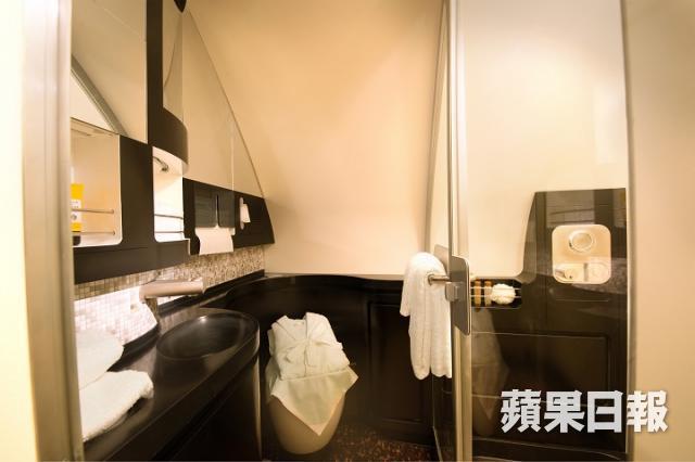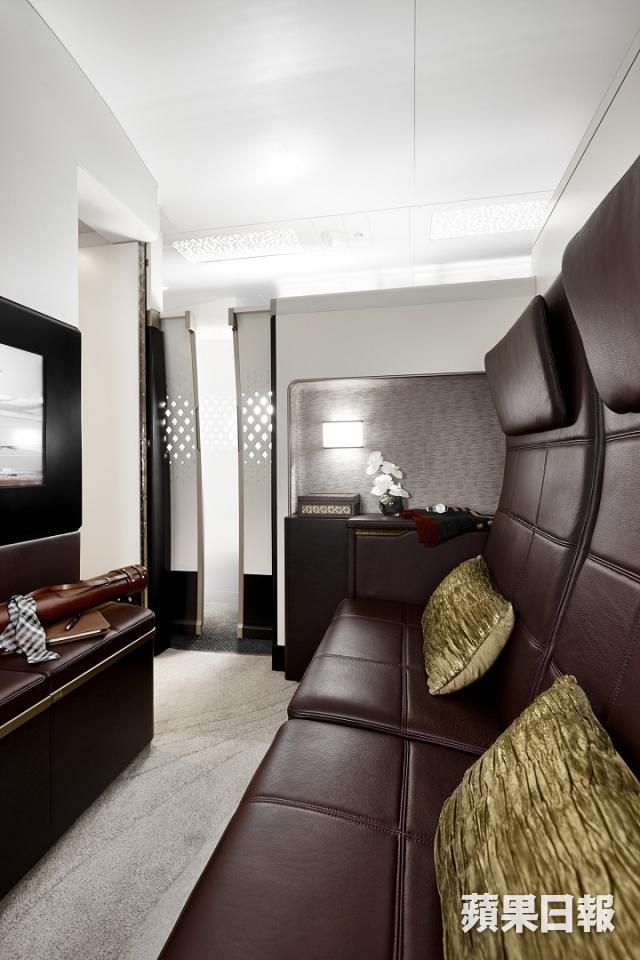推開門,小客廳、獨立浴室及卧室三房相連,面積達125平方尺,每架A380只有1間矜貴的空中豪宅,位於機艙上層前甲板,最多可住2位乘客,堪稱史上最強頭等艙。設備儼如一架私人機,客廳用上跟法拉利同廠的Poltrona Frau真皮梳化,可放雙人餐桌撐枱腳,還有32吋大電視及迷你酒吧;走入卧室有一張82吋長雙人床,另備有27吋電視,最愛浴室設有淋浴間,可沖個熱水涼。
