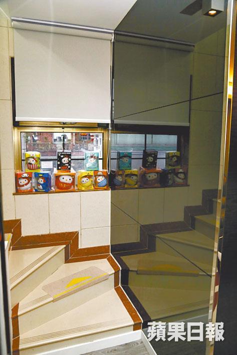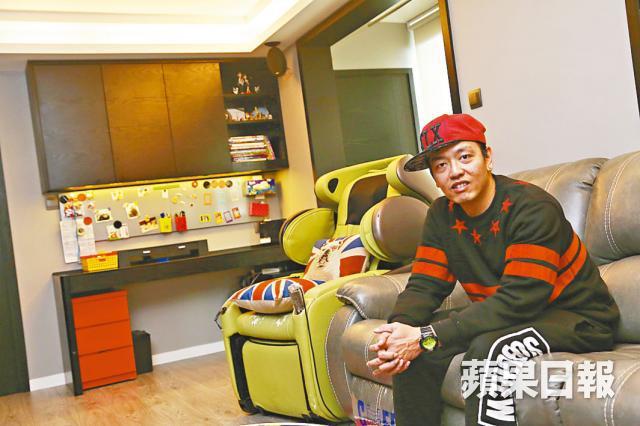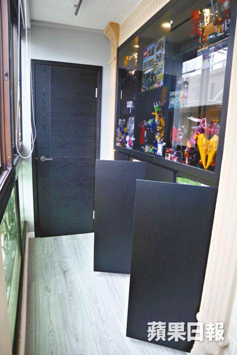 戶主多年來搜購大量動漫公仔,特別在梳化後做飾櫃,採用雙面式設計,向客廳上方設玻璃層架,裝置射燈照亮心頭好,有視覺趣味。飾櫃下方背對露台做貯物櫃,可收藏雜物。
