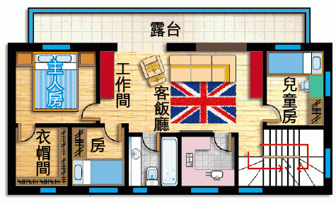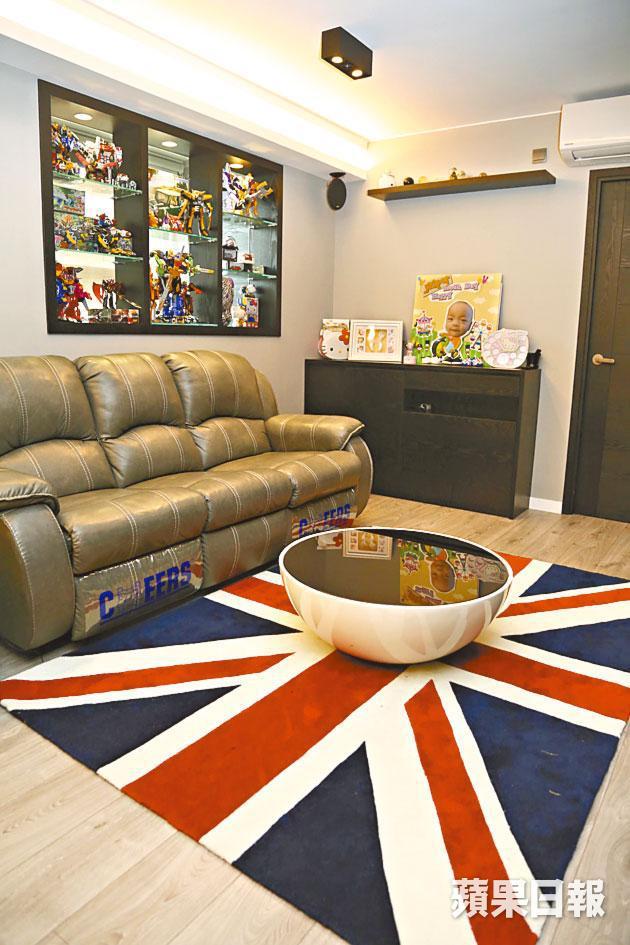戶主鍾情英倫風,客飯廳放置國旗咕𠱸及大幅地氈,紅白藍色米字圖案搶眼,在深沉佈局中起聚焦作用。