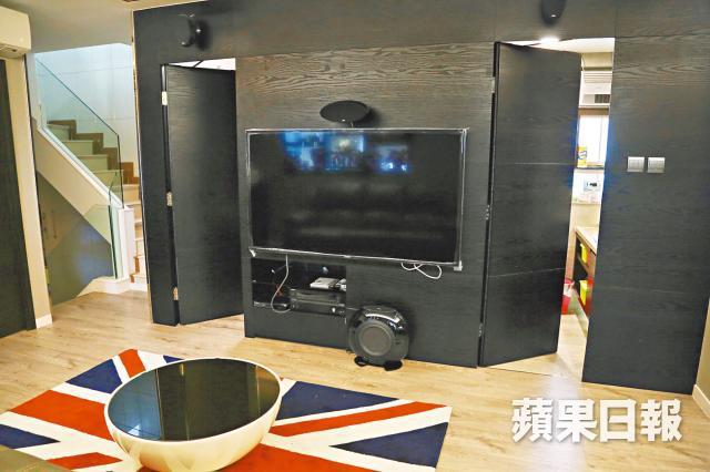 年輕男戶主覺得黑色夠型格,有個性,但顏色深,不及白色具空間感,設計師於是在電視後牆壁與廚廁入口,做牆飾板及隱藏門,全幅以橫紋橡木做,有拉闊的錯覺,將電視下方層架藏身廚房地櫃內,無阻出入通道,亦有慳位用途。