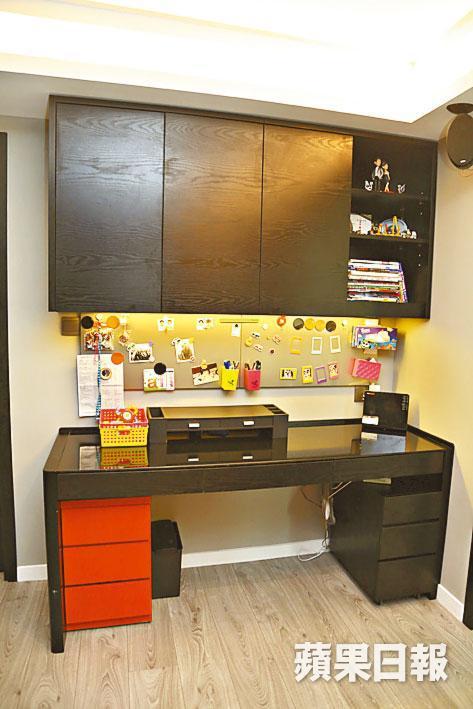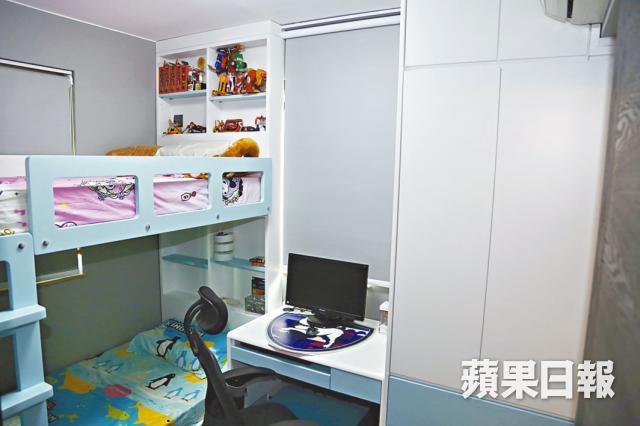 由於屋主兒子未足一歲,兒童房悉心打造為藍白色天地,內裏睡床、書枱及衣櫃齊備,兼且保留適量活動空間,即使小朋友長大,亦有足夠地方使用。小朋友睡床特意打造成上下架款式,亦為未來家庭新成員作好準備。睡床使用固定樓梯,省掉活動式搬來搬去及找地方安置的麻煩,又考慮上落舒適感覺,每級加闊及做圓邊,設計細心。床頭設有層架擺放小朋友的心愛玩具,方便隨意取放。