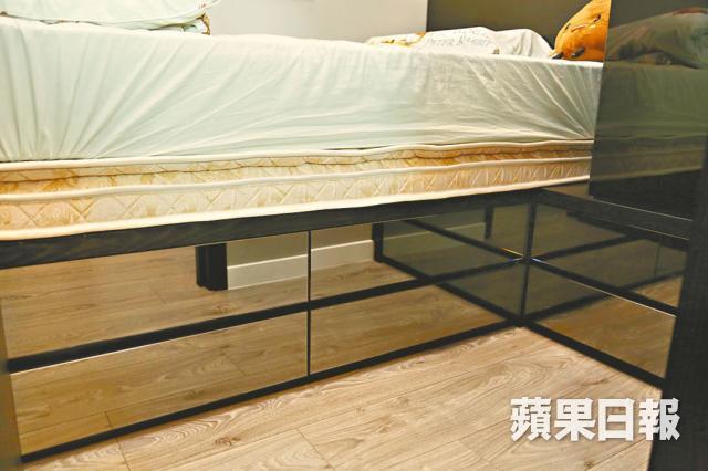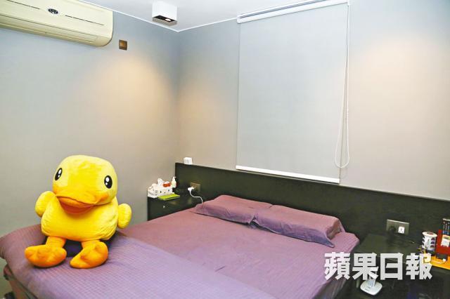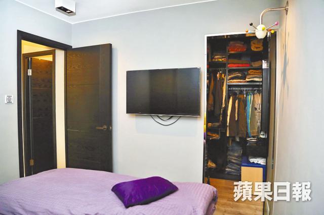 主人房及鄰房牆身髹灰色油,訂做黑色家具,主人房衣帽間入口設不銹鋼框及玻璃門,鄰房床底抽屜鑲灰鏡飾面,房間細用深色都無壓迫感。