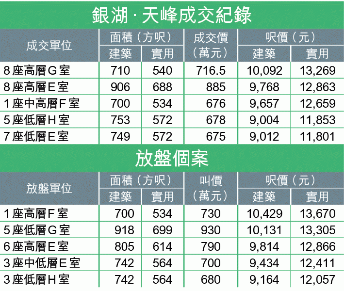 現時銀湖.天峰有約150個放盤,但市價放盤僅約50個,兩房單位入場費650萬元,三房戶最低消費870萬元。本月截至23日屋苑暫錄13買賣成交,平均建築呎價9,697元,平均實用呎價12,724元。