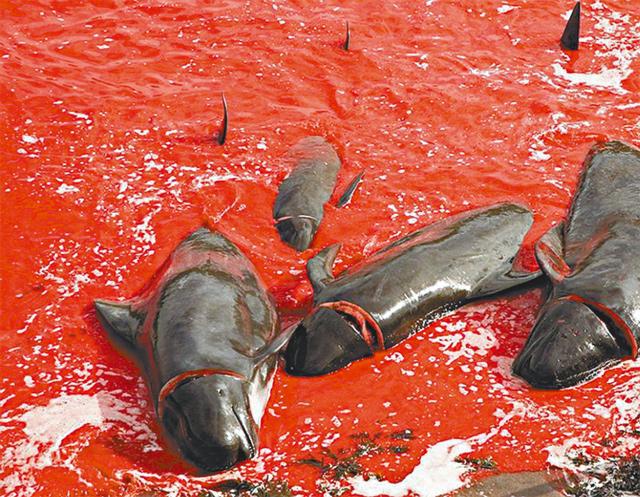大海一片血紅,確是「末日」異象--這是領航鯨的末日。位於挪威海和北大西洋之間海域的法羅群島(Faroe Islands),近日舉行夏季獵鯨活動,短短一天就捕殺了多達250條領航鯨,獵人利刀此起彼落,迅速將海水染成血紅。