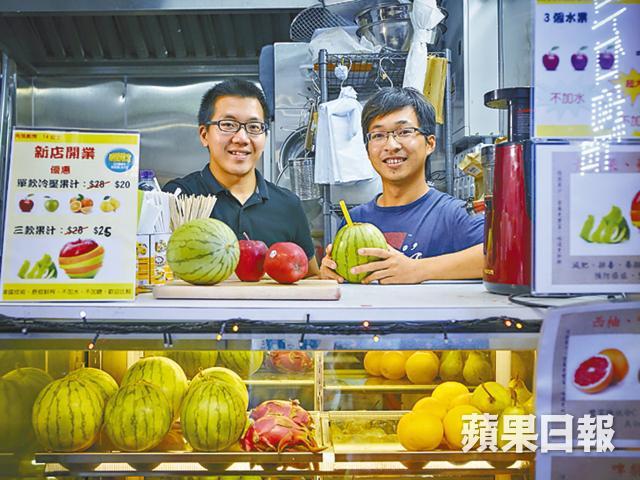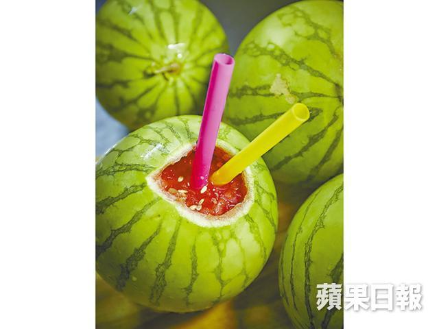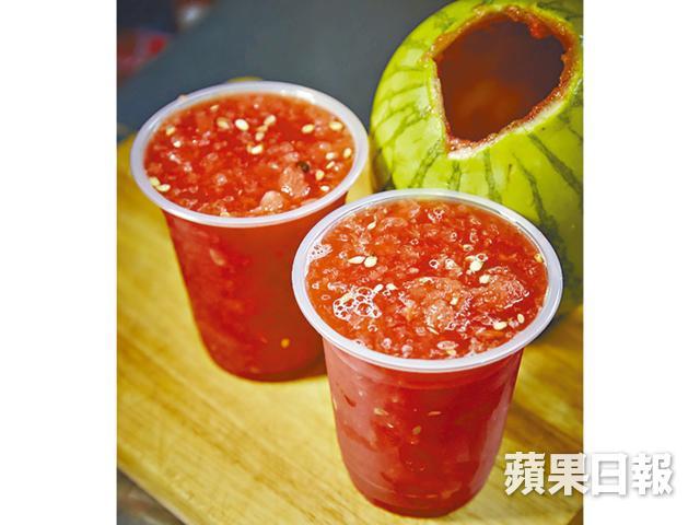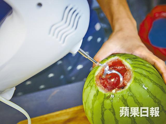早前在青衣大戲棚爆紅起來的「電鑽原個西瓜汁」有人愛又有人怕,愛其原汁原味,但見到強大馬力的電鑽機把西瓜鑽得血紅果汁四濺,又有點心驚。油麻地新開的果汁店,兩個年輕老闆Richard和Ben受到這電鑽啟發,決定有樣學樣,不過他們用的器具是電動打蛋器和打麵糰用的擀麵棍,先把西瓜頭破開,插入攪麵棍轉啊轉,西瓜肉便已輕輕攪碎,不到兩分鐘便打起一個,其間沒有瓜汁四濺,亦毋須擔心電鑽頭的衞生,這溫和版的電鑽西瓜汁更教人放心。Ben說他和拍檔每隔兩晚便要趁凌晨打烊後,去附近的油麻地果欄入貨,「西瓜熟得快,太熟一鑽便爆開,所以要趁新鮮,惟有密密入貨。」選瓜也有學問,西瓜按體形大小分九級,他們選用的是中等偏大的5號瓜,直徑約六至七吋左右,拿上手大小剛好,「我們試了四至五種瓜,最後選用新彊種的美國西瓜,果汁清甜,而且皮非常薄,可以打更多汁。」