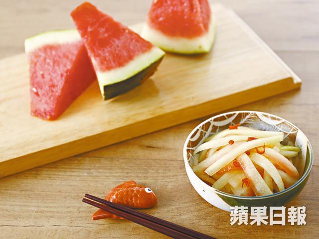 西瓜皮除了用來洗臉或用來跣人,還可以做甚麼?看到這個涼拌西瓜皮菜式,平日吃慣切粒西瓜、連西瓜外皮也不知道是綠色的新世代可能覺得,香港食物充足,不用這麼慳家吧?然而,吃西瓜皮不為慳家,只為美味。那層連接紅色果肉的淺綠果皮,爽口脆嫩,醃漬涼拌起來,比青瓜更清爽,更讓人念念不忘,還有清熱消暑去水腫的妙用,怎可以不試!