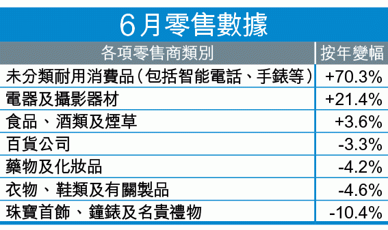 至於5月剛做完周年大減價的百貨公司,6月銷售由升轉跌,按年減少3.3%;而今年提早做夏季減價的服裝鞋履,表現繼續無起色,按年跌4.6%。