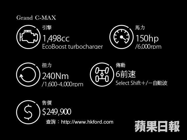 Grand C-MAX不單止車價平夠吸引力,它搭載的1.5公升EcoBoost turbocharger引擎,相信也是賣點之一,因為大部份中型MPV都是1.8至2.0公升,相比之下此車牌費較平。馬力輸出只有150匹,不過低至1,600轉便可全數釋出240Nm峯值扭力,令起步力量感覺十分充足,相當有驚喜。其次便是油耗受惠,配備智能怠速自動熄匙系統,廠方提供綜合油耗數據為15.1km/L,即每公里油費約$1,算是經濟。不論車價還是實用性,這車的確有本錢吸走日系MPV客,唯一考慮只是Ford在港的二手承接力較弱。
