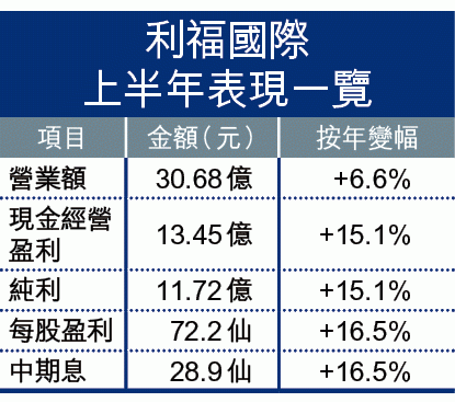 【本報訊】持有銅鑼灣崇光百貨的利福國際(1212)派發上半年成績表,期內靠投資及滙兌收益上升,令純利按年增長15%至11.72億元,勝市場預期;惟如扣除這些非經營收入,利福期內核心盈利實為「零增長」。主席劉鑾鴻預告,由於受內地股災等因素拖累,7月銷售「會差得更明顯」,預期下半年零售市道「會辛苦」。