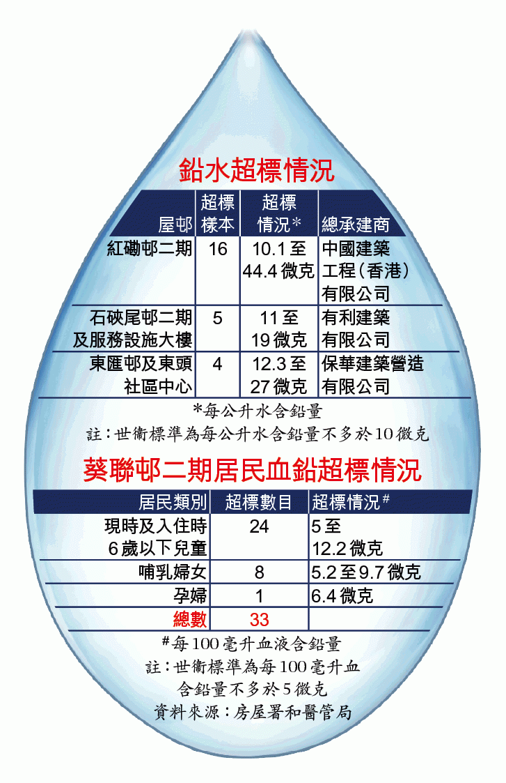 當局指3個屋邨中以中國建築承建的紅磡邨二期超標最嚴重,74個水辦有16個超標,含鉛量介乎每公升水10.1至44.4微克,含鉛量最多屬紅昕樓一單位,超標達3.4倍,該邨水喉承辦商為金日工程有限公司,而紅昕樓獲「優質供水認可計劃」證書;同樣由金日承辦水喉工程的東匯邨52個水辦則有4個超標,含鉛量最多為每公升水27微克,由明合有限公司承辦水喉工程的石硤尾邨二期59個水辦有5個超標,含鉛量最多為每公升水19微克。明合同樣承辦早前中招的牛頭角下邨水喉工程。