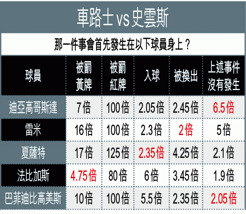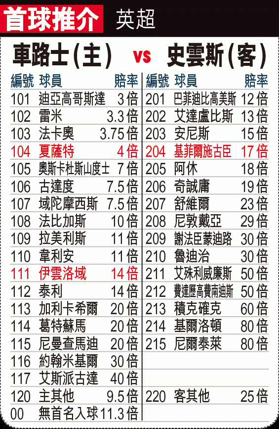 周六夜場,輪到衞冕的車路士在史丹福橋球場出擊,面對「天鵝軍」史雲斯。藍戰士中鋒迪亞高哥斯達因傷缺陣,影響到球隊的把握力,而且他們過去10次跟史雲斯交手中,有七次開入球「細」,所以今仗宜吼「細」。(球賽編號:星期六56;now621台明日0:30am直播)