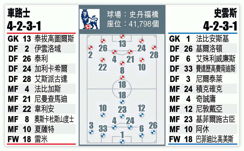 史雲斯今夏陣容變動不大,尤其是後防,艾殊利威廉斯、費達歷高費南迪斯、基爾洛頓及法比安斯基等上季主將都留隊,相信這道防線的默契會更勝上季,有力抵擋沒有哥斯達的車路士鋒線。翻查往績,自從史雲斯在11/12球季升上英超後,兩隊在各項賽事曾10度交鋒,車路士取得六勝三和一負的成績,但值得留意的是,這10場對賽中,有多達七場開出入球「細」。