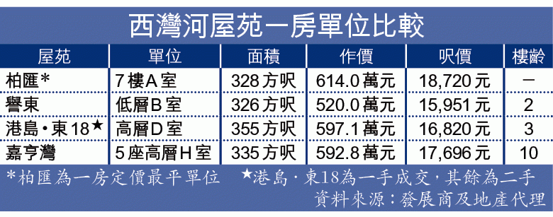 近年西灣河及筲箕灣多個單幢新盤開售的平均呎價低於2萬元,柏匯開價卻相當進取,呎價與區內臨海指標屋苑嘉亨灣相若,較鯉景灣更貴逾三成。而柏匯對面的港島.東18,年初賣貨尾時呎價約1.63萬元,兩個面對面的樓盤呎價存在三成差距,認真誇張。