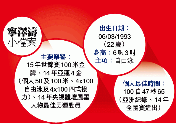 亞洲泳手受先天條件所限,爆發力不及西方選手,故多數只能在較長途的項目爭牌;寧澤濤周四卻在短途的100米自由泳為黃種人吐氣揚眉。身高六呎三吋的寧澤濤,在決賽以0.11秒之微力壓比他矮三吋的澳洲新星麥伊禾,摘下代表着世界冠軍頭銜的金牌;阿根廷的加比治獲得一面銅牌,倫奧冠軍艾安恩僅與另一選手並列第七。