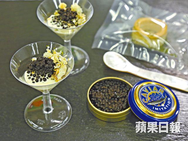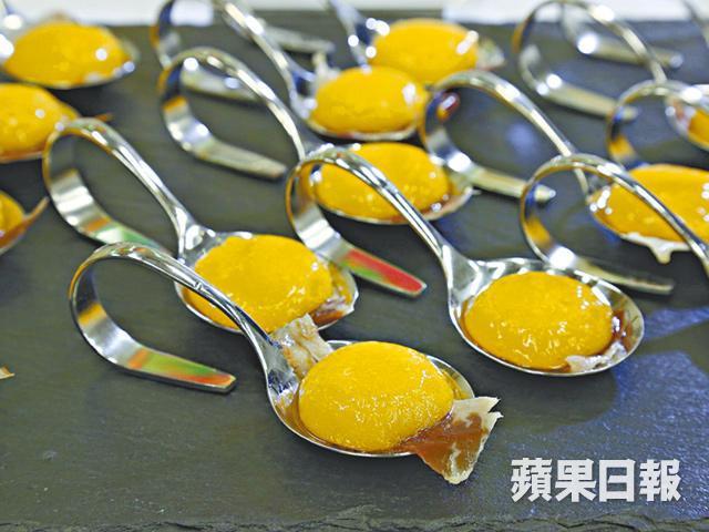 以鈣和海藻酸鈉製成的哈密瓜晶球外形像蛋黃,薄膜包住流心瓜汁,配味濃的火腿同吃。