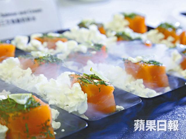 分子料理到會跟一般到會有何不同?就是好玩!試食一開始,記者和Ricky恍如進入魔術世界和遊樂園,只見主理廚師徐匡龍(Arthur)拿出液態氮來「炒」酸忌廉慕絲,劈劈啪啪幾秒間,炒得冷煙四散,酸忌廉變成噴煙爆谷,配上煙三文魚塊,造型美奐,連入廚房無數的記者和Ricky都忍不住拿手機拍照留念,可想而知,平日沒怎進廚房的人會有多驚喜。