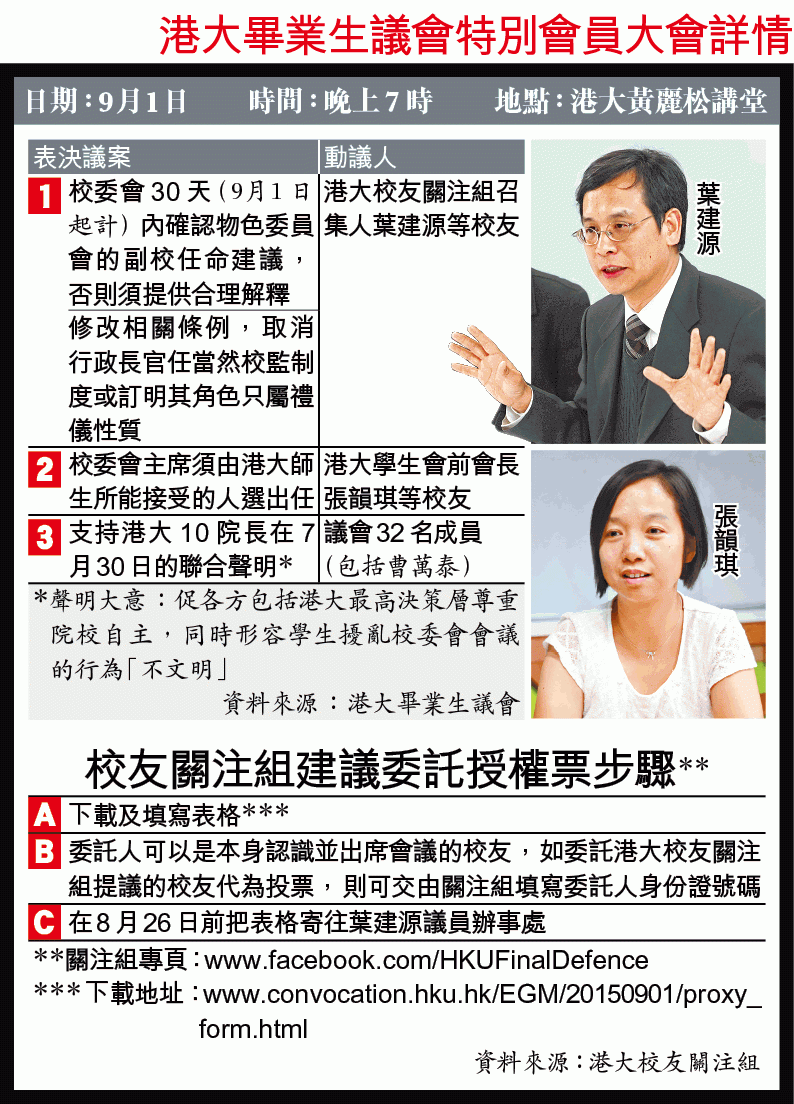 另一校友、2000年學生會會長張韻琪動議校委會主席必須獲教職員及學生同意。她表示,投票是要清晰表達訴求,但港大校友眾多,收集授權書不易,「帶定表格,一見校友就叫簽」。據了解,有校友擬擺街站,收集校友授權信。
