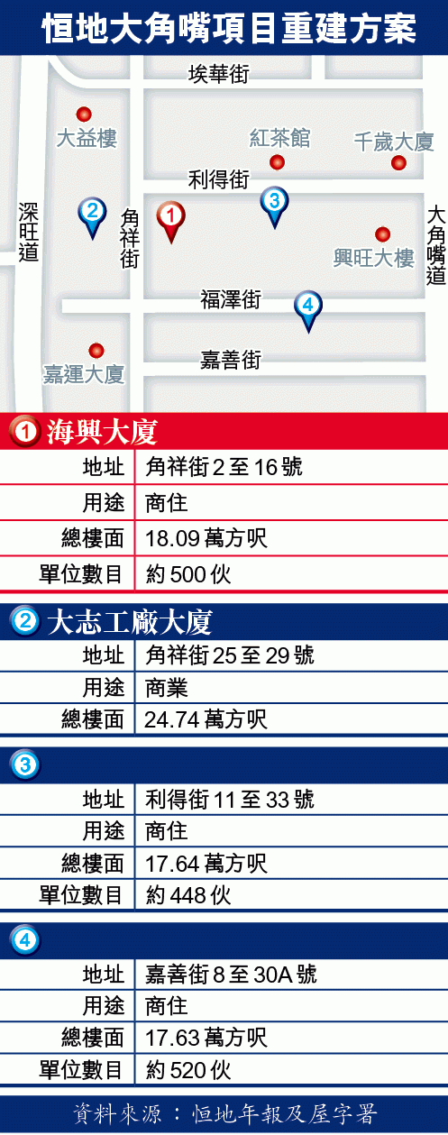 【本報訊】近年主力透過併購市區舊樓大起「劏房」單位的恒地(012),擬重建曾發生駭人聽聞弒親碎屍案的大角嘴海興大廈,將其發展成單幢樓,估計提供約500伙。連同區內其餘2個住宅重建項目,料可提供近1,500個單位,規模與鄰近大型屋苑君匯港相若。
