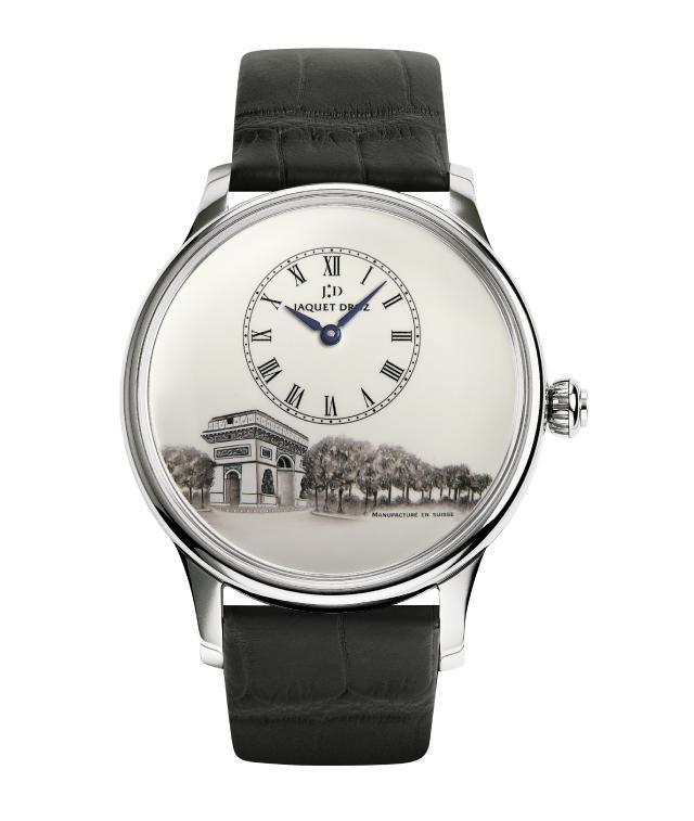建築與手錶,風牛馬不相及吧,看看手錶,原來Mido錶款背後靈感,均源自不同建築物。Jaquet Droz則是另一種情況,並非直接以建築物某些特徵為設計靈感,而是品牌歷史上與某座城市的淵源。例如倫敦,1774年創辦人Jaquet Droz先生想擴展生意,便從瑞士小城La Chaux-de-Fonds來到倫敦開設工坊;再例如巴黎,他曾帶着家族研發的自動機械人偶(Automaton)在法國國王路易十六面前表演。當提起Jaquet Droz歷史,這兩個時刻永不能錯過,所以品牌就分別將雙城的兩座標誌性建築物繪畫在錶盤中,帶來兩枚手錶Petite Heure Minute Harrods(哈洛德百貨公司)與Petite Heure Minute Arc de Triomphe(巴黎凱旋門),來個穿越百年的跨界。